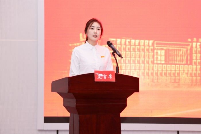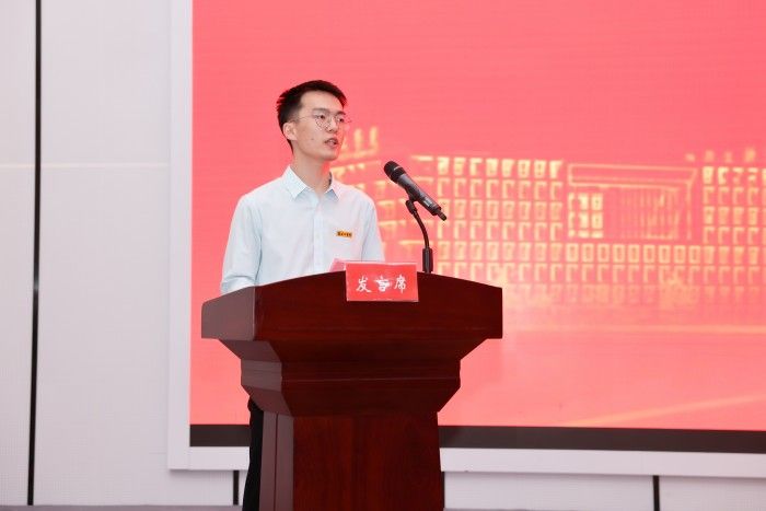 在校研究生代表、机械专业2021级研究生周廷玉,研究生新生代表、材料科学与工程专业2023级新生高佳雯发言