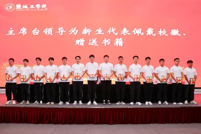 与会领导为2023级研究生新生代表佩戴校徽和赠书