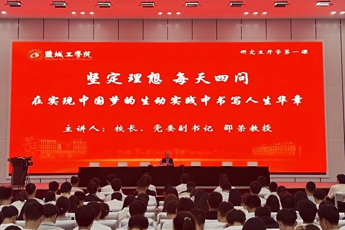 开学典礼后,邵荣以《坚定理想 每天四问 在实现中国梦的生动实践中书写人生华章》为题,为全体2023级研究生讲授“开学第一课”。他从“了解盐城,打开心扉”“认识盐工,筑梦同行”“每天四问,奠基人生”等三个方面展开,强调大学的根本任务,是立德树人,厚德要放在第一位。他勉励同学们每天问自己“我的身体有没有进步?我的学问有没有进步?我的工作有没有进步?我的道德有没有进步?”并且灵活运用、行到做到,盐工期望学子的四成——成人、成才、成业、成功也就自然“水到渠成”。他强调,“青年强,则国家强。”习近平总书记在二十大报告指出:“广大青年要坚定不移听党话、跟党走,怀抱梦想又脚踏实地,敢想敢为又善作善成,立志做有理想、敢担当、能吃苦、肯奋斗的新时代好青年,让青春在全面建设社会主义现代化国家的火热实践中绽放绚丽之花。”他衷心祝愿研究生新同学们,坚定理想信念,志存高远,脚踏实地,以止于至善的决心,坚持每天四问,日日求新,勇做时代的弄潮儿,在实现中国梦的生动实践中放飞青春梦想,在为人民利益的不懈奋斗中书写人生华章!