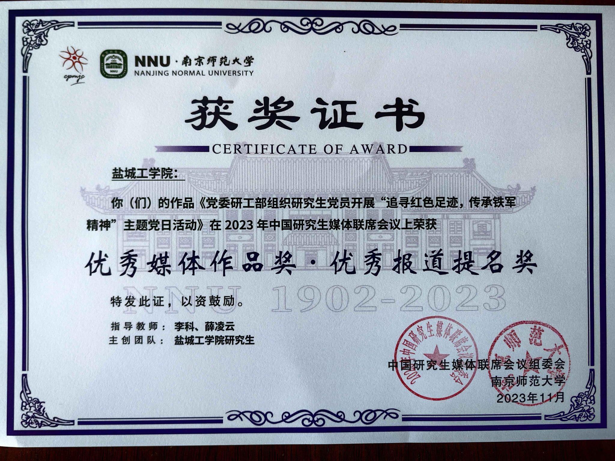 经自主申报、组委会评审、高校互评等环节,我校报送的作品《党委研工部组织研究生党员开展“追寻红色足迹,传承铁军精神”主题党日活动》荣获优秀媒体作品奖·优秀报道提名奖、《乐竞登陆入口研究生教育》荣获媒体嘉年华优秀竞展奖,实现了我校研究生教育媒体作品获奖零的突破。