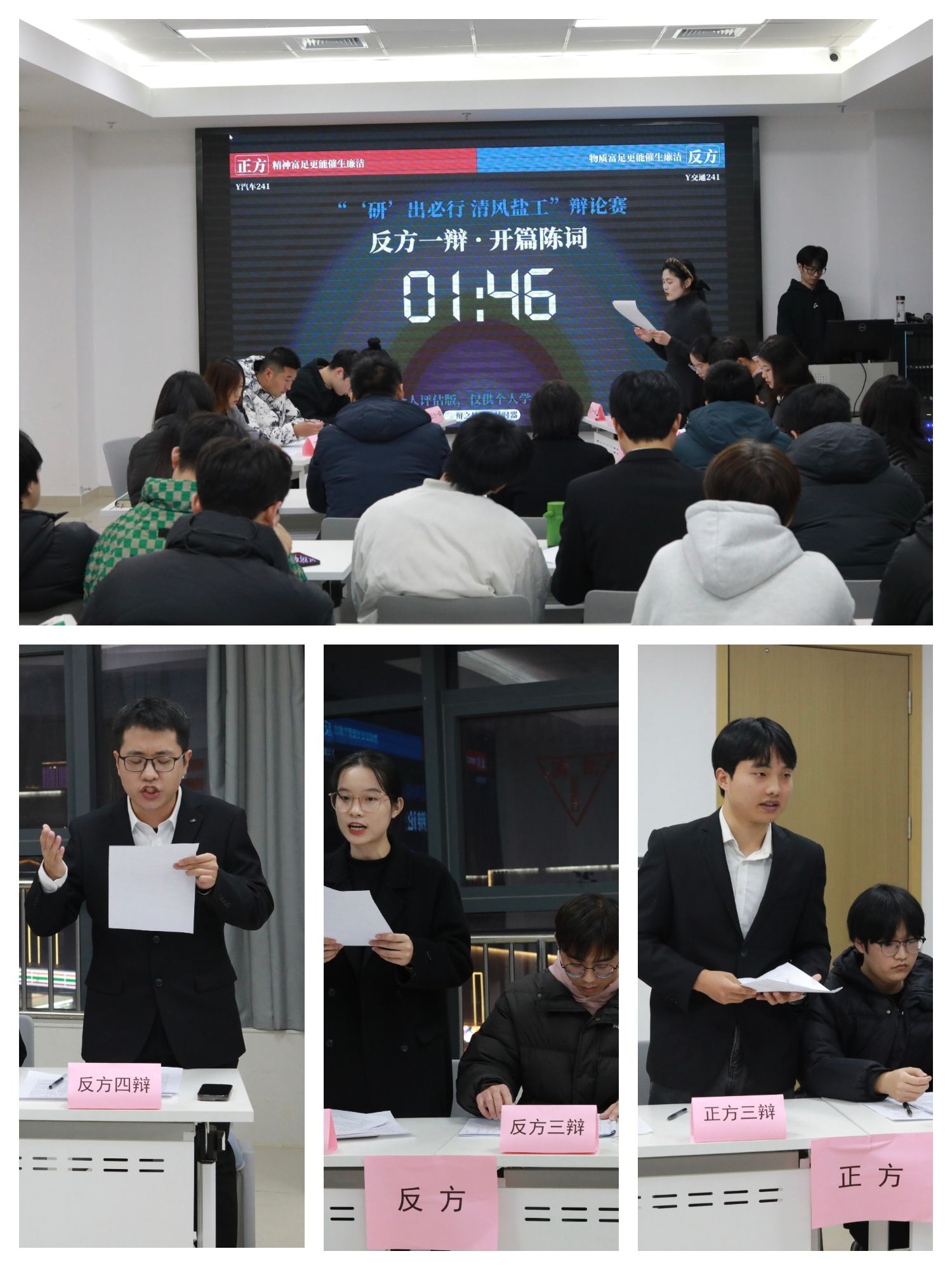 为进一步加强校园廉洁文化建设,增强研究生廉洁自律意识,规范廉洁自律行为,党委研究生工作部举办了“‘研’出必行 清风盐工”研究生廉洁教育主题辩论赛。经过数周的激烈角逐,决赛于12月12日晚在盐龙湖校区盐龙湖先进技术研究院429教室圆满落幕。校社会科学处处长包雅玮,团委副书记胥爱国,党委研究生工作部副部长、研究生院副院长姜华,盐龙湖校区管委会、大学科技园、技术转移中心副主任、党总支副书记张建功,党委宣传部网络思政科科长江莹担任决赛评委。2024级研究生代表观看了比赛,座无虚席、气氛活跃。