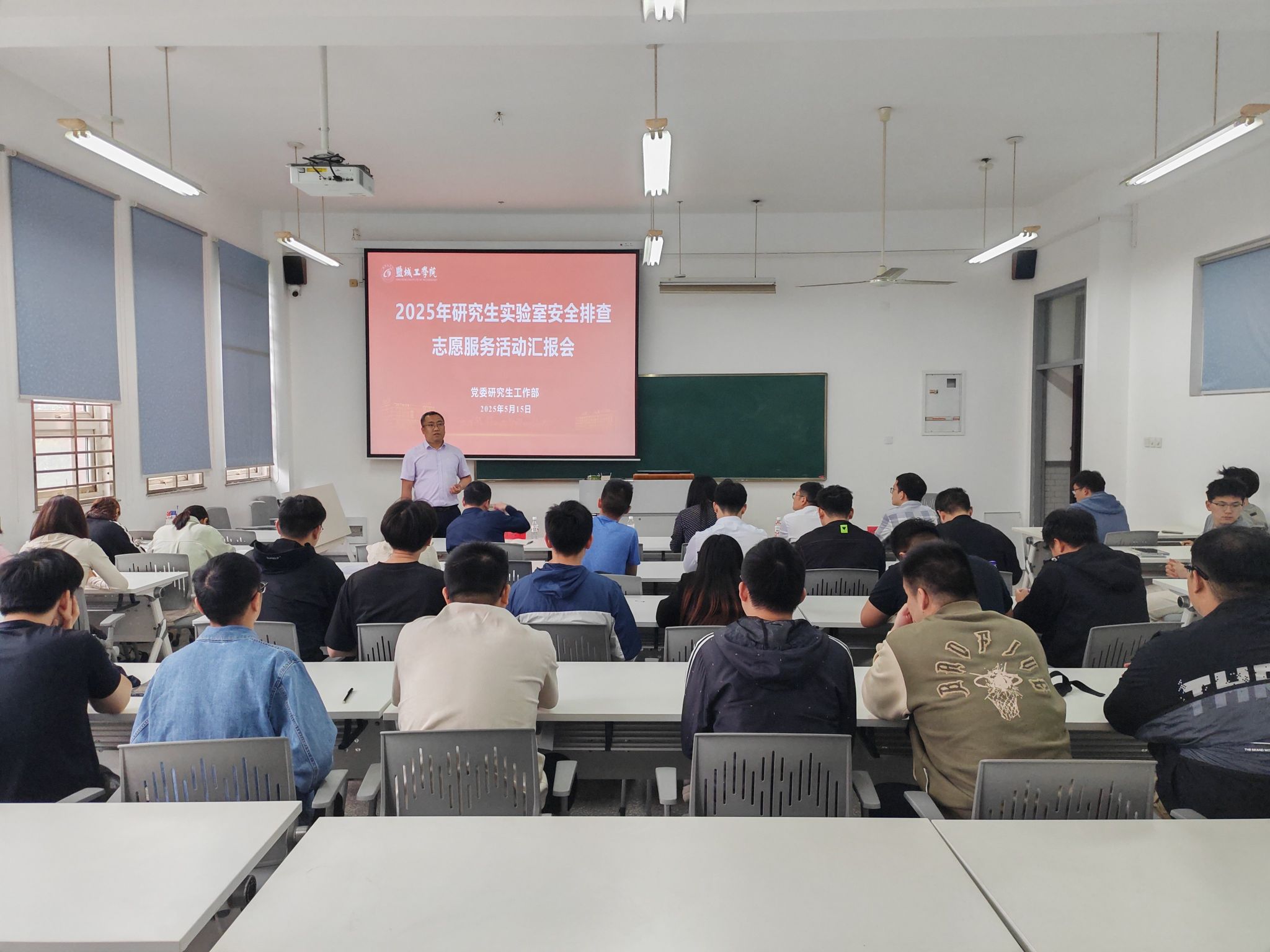 为深入贯彻落实教育部关于加强高校实验室安全管理工作的指示精神,进一步提升研究生科研实践中的安全意识和隐患排查能力,筑牢校园安全防线,5月15日上午,党委研究生工作部组织召开2025年研究生实验室安全排查志愿服务活动汇报会。实验室建设与设备管理处副处长姜瑞雨、党委研究生工作部副部长、研究生院副院长姜华,机械工程学院实验中心主任董香龙、化学化工学院实验中心主任冒爱荣、材料科学与工程学院实验中心主任何寿成出席,研究生辅导员、志愿服务队全体成员等40余人参加。