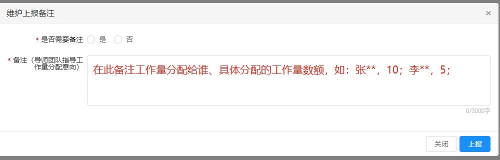 点击“确认上报”后会弹出对话框,请涉及导师团队指导研究生须进行指导工作量分配的老师选择“需要备注”并填写分配明细。(工作量的发放将以此为依据,请各位老师仔细核对后填写)