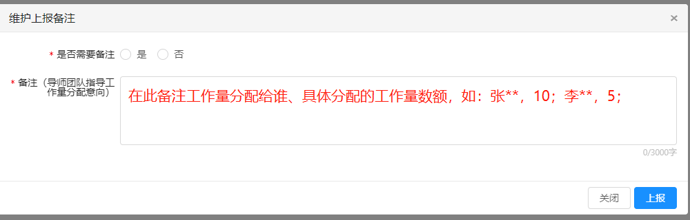 2.点击“确认上报”后会弹出对话框,请涉及导师团队指导研究生须进行指导工作量分配的老师选择“需要备注”并填写分配明细。(工作量的发放将以此为依据,请各位老师仔细核对后填写)