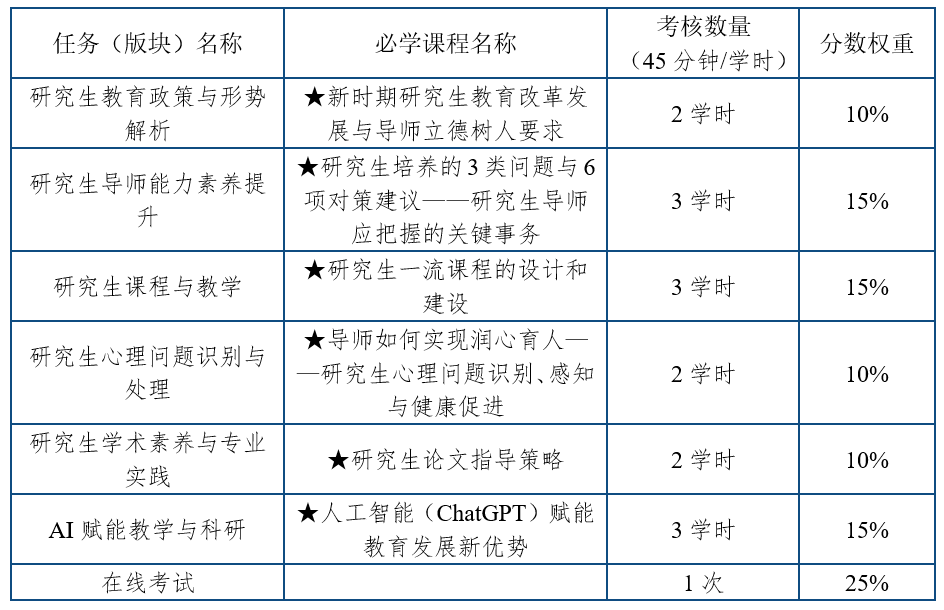 本次培训围绕研究生教育政策与形势解析、AI赋能教学与科研、研究生导师能力素养提升、研究生课程与教学、研究生心理问题识别与处理、研究生学术素养与专业实践等内容开设了相关课程。参训导师需完成课程学习、在线考试两个环节学习任务。