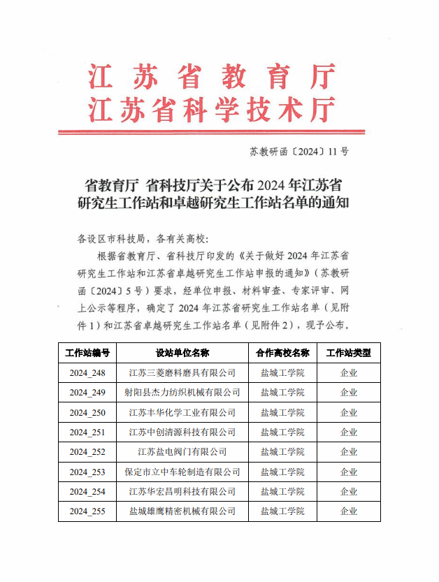 近日,江苏省教育厅、科技厅联合发布《关于公布2024年江苏省研究生工作站和卓越研究生工作站名单的通知》(苏教研函[2024]11号),我校与江苏三菱磨料磨具有限公司、保定市立中车轮制造有限公司等单位合作共建的8个研究生工作站名列其中,获批总数位居省内同类高校第一。